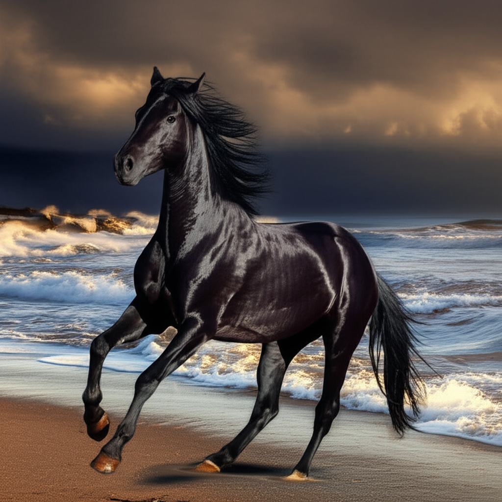 Wild horse galloping stormy ocean beach, dramatic golden hour.
