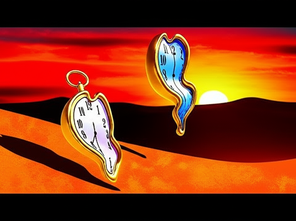Melting clocks on dune, crimson sunset, surreal, Dali style.