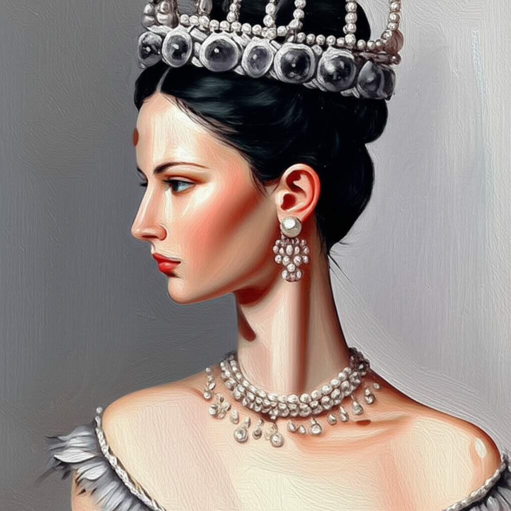 A portrait of a queen in oil painting style, in minimal style, depicting fashion