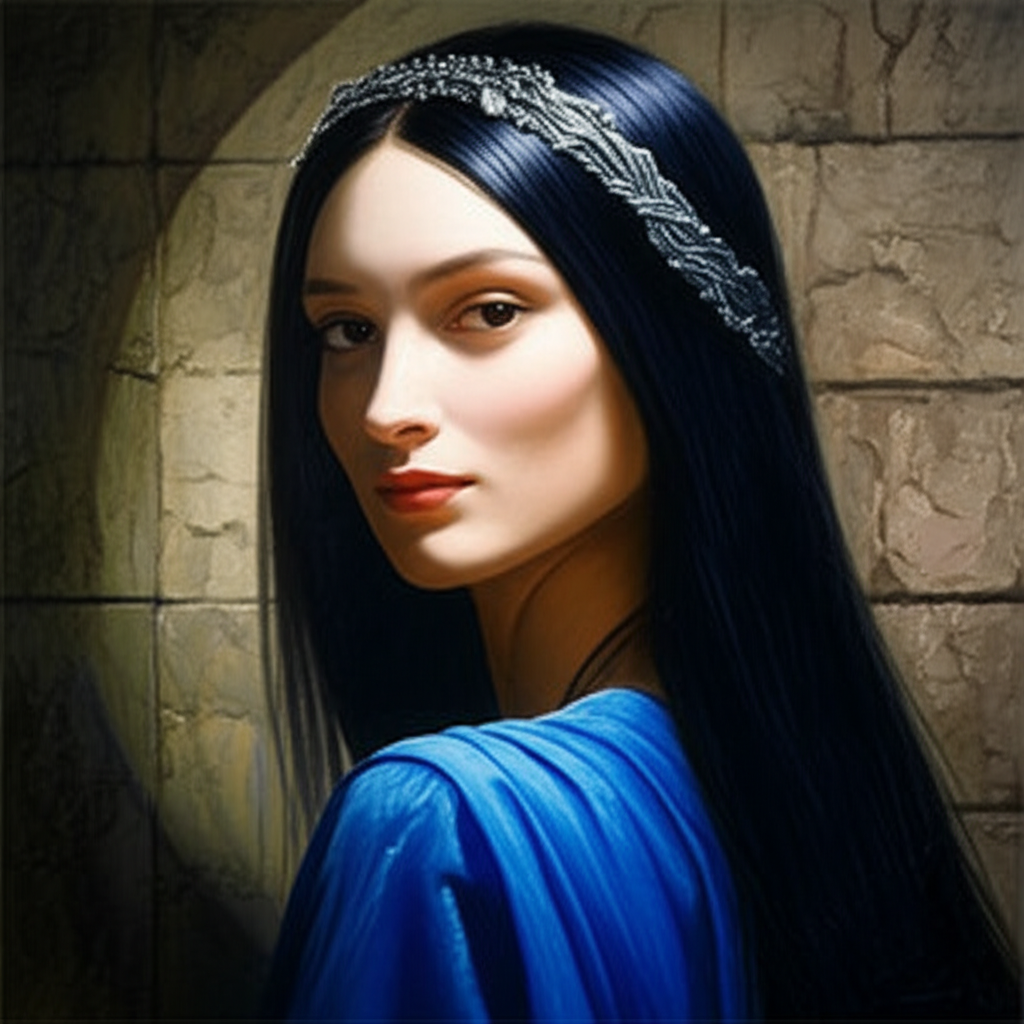A dramatic, chiaroscuro oil painting portrait of a mysterious young queen, around 25 years old, with an enigmatic half-smile and dark, captivating eyes. Her long, dark hair is woven with silver threads, and she wears a minimalist, antique silver circlet. Her gown is made of midnight blue silk that drapes elegantly, hinting at hidden strength. The lighting is theatrical, with a single strong light source casting deep shadows across her face and the ancient, stone-walled chamber behind her, creating an atmosphere of quiet introspection and intrigue. The color palette is dominated by deep jewel tones and muted grays.