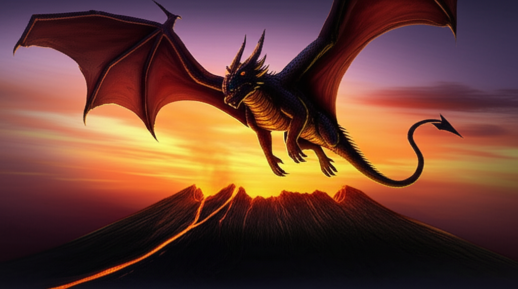 A majestic dragon flying over a volcano at sunset