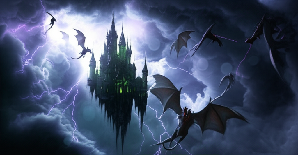 A dark, gothic floating fortress looms menacingly above a turbulent, swirling mass of indigo and charcoal storm clouds, illuminated by intermittent flashes of deep purple lightning. The castle's architecture is sharp and jagged, with ominous gargoyles perched on every spired peak and a faint, eerie green glow emanating from within its shadowed windows. A few massive, shadowy dragons with glowing ruby eyes and scarred, leathery wings circle the castle, their immense forms silhouetted against the stormy sky, exuding a sense of ancient power and foreboding. Atmospheric, dramatic chiaroscuro, dark fantasy concept art, highly detailed, photorealistic render.