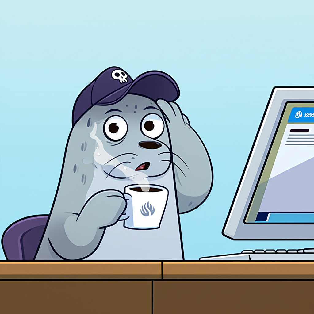 A digital 2D cartoon-style illustration of a gray seal sitting at an office desk, looking stressed while staring at a computer screen. The seal has big round eyes, a slightly open mouth in shock, and is holding a steaming mug of coffee with one flipper while touching its forehead with the other. It wears a dark navy baseball cap featuring a white skull emblem on the front. The computer monitor shows an email interface with the blue “SECO” logo visible on the screen. The background is light blue with soft lighting, clean lines, and smooth shading for a polished, modern comic aesthetic.