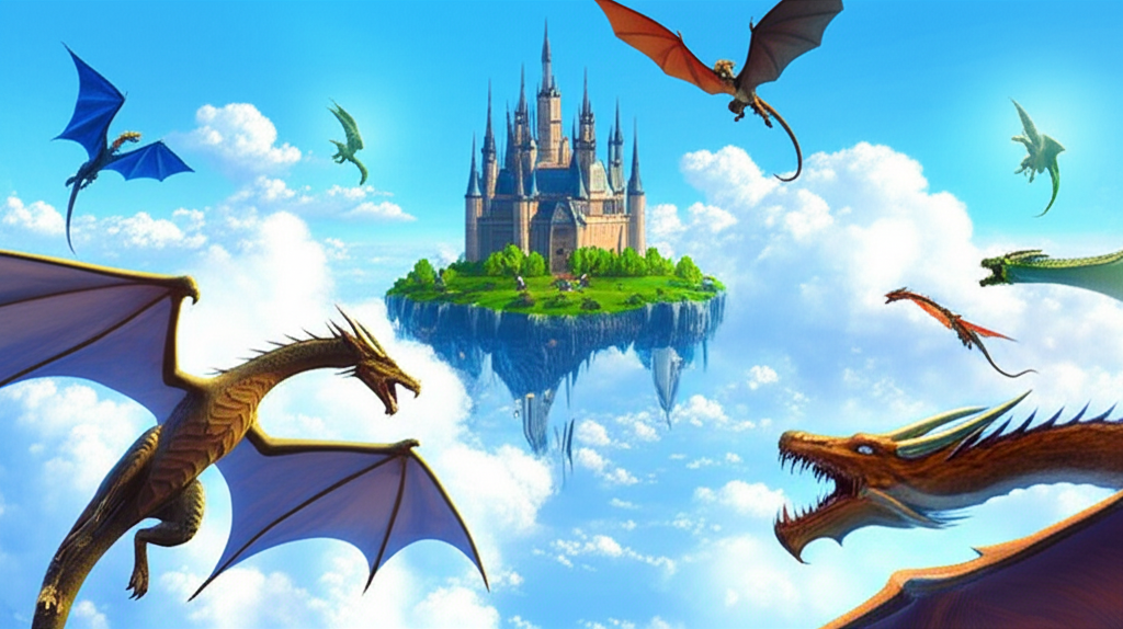 A floating castle above the clouds surrounded by dragons