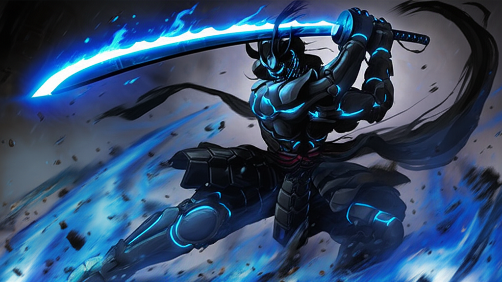 Oni Hayabusa, mechanical oni samurai lunging forward with one leg bent, holding an enormous glowing blue katana overhead in one hand, scarf whipping through the air, black segmented armor illuminated with energy veins, glowing eyes, surrounded by blue flame and debris, cinematic motion lighting, painterly MTG art style, epic fantasy atmosphere.