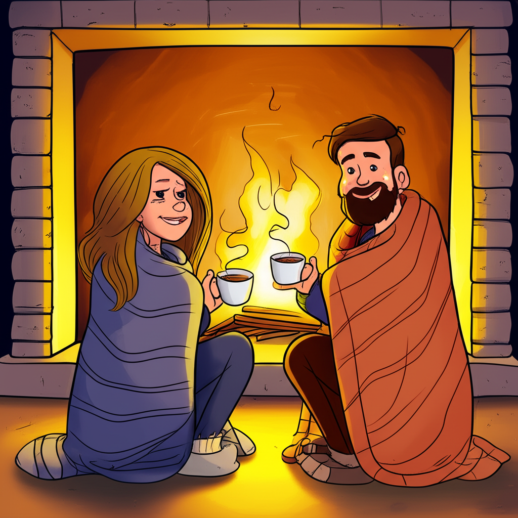 şömine altında battaniyeyle oturan kadın ve erkek yanlarında 1 bardak kahve, in cartoon style