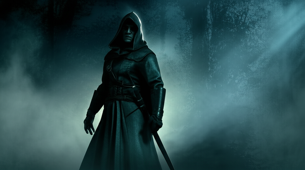 A mysterious, cloaked figure with a lean build and an enigmatic expression stands in a moonlit, fog-shrouded ancient forest. He wears dark, utilitarian leather armor beneath his hooded cloak, and wields a sleek, single-edged longsword with a dark hilt, held loosely at his side. Subtle beams of moonlight pierce through the dense canopy, creating dramatic shadows and highlighting the mist. The mood is eerie and suspenseful, with a dark fantasy, realistic render, and a cool, muted color palette dominated by blues and greens.