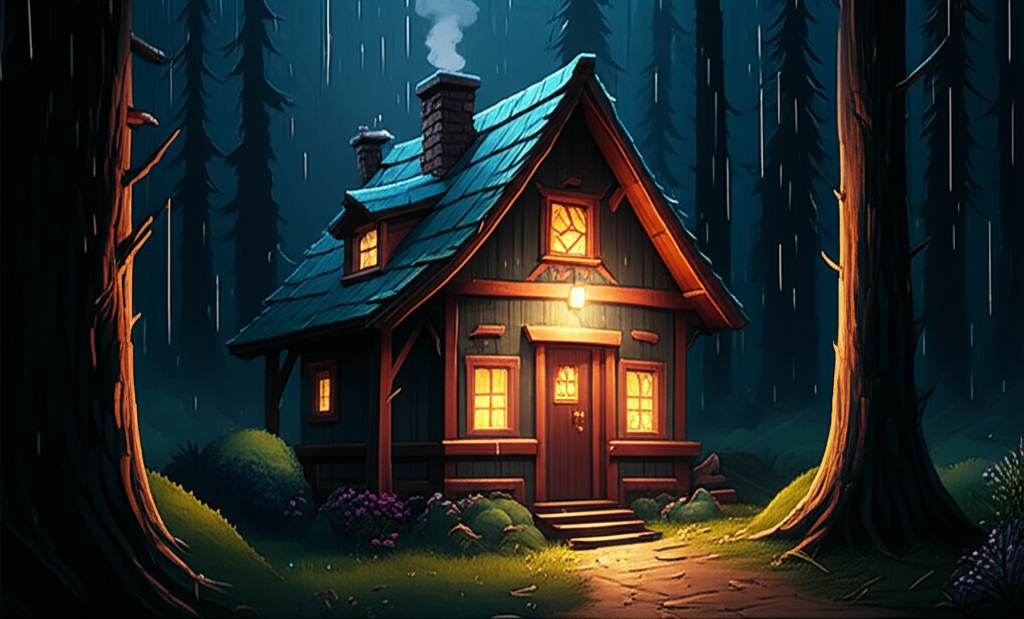 ormanın derinlerinde minik kulube sarı ışıkları var ve hava yağmurlu