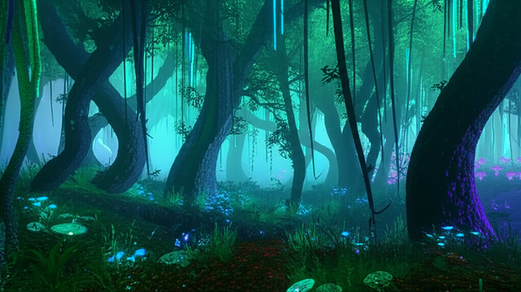 Enchanted forest, bioluminescent flora, misty, ancient.