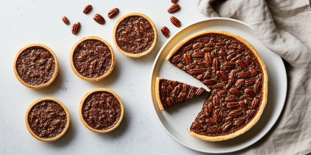 Multiple 4-inch pecan pies arranged elegantly, with one 8-inch pecan pie sliced on a minimalist neutral plate. The pecans are finely chopped into small pieces. Styled in a sophisticated, earthy, and premium lifestyle scene, with soft natural lighting, clean neutral background, subtle linen or muted props, minimalist composition. Calm, refined, luxurious atmosphere, realistic photography, editorial style, modern and unisex aesthetic, shallow depth of field. High-resolution, 16:9 wide banner composition, suitable for website hero and social media.