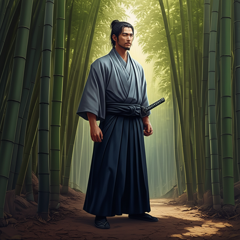 A stoic samurai warrior stands in a tranquil bamboo forest, shafts of dappled sunlight filtering through the dense canopy to illuminate his calm demeanor. He wears a dark indigo hakama and a muted grey kimono, with traditional lightweight samurai armor subtly integrated. His hand rests near the sheathed katana at his hip, its simple yet elegant hilt visible. The air is still, creating a serene and contemplative mood. The color palette is dominated by lush greens, earthy browns, and deep indigos, rendered in a realistic, naturalistic style.