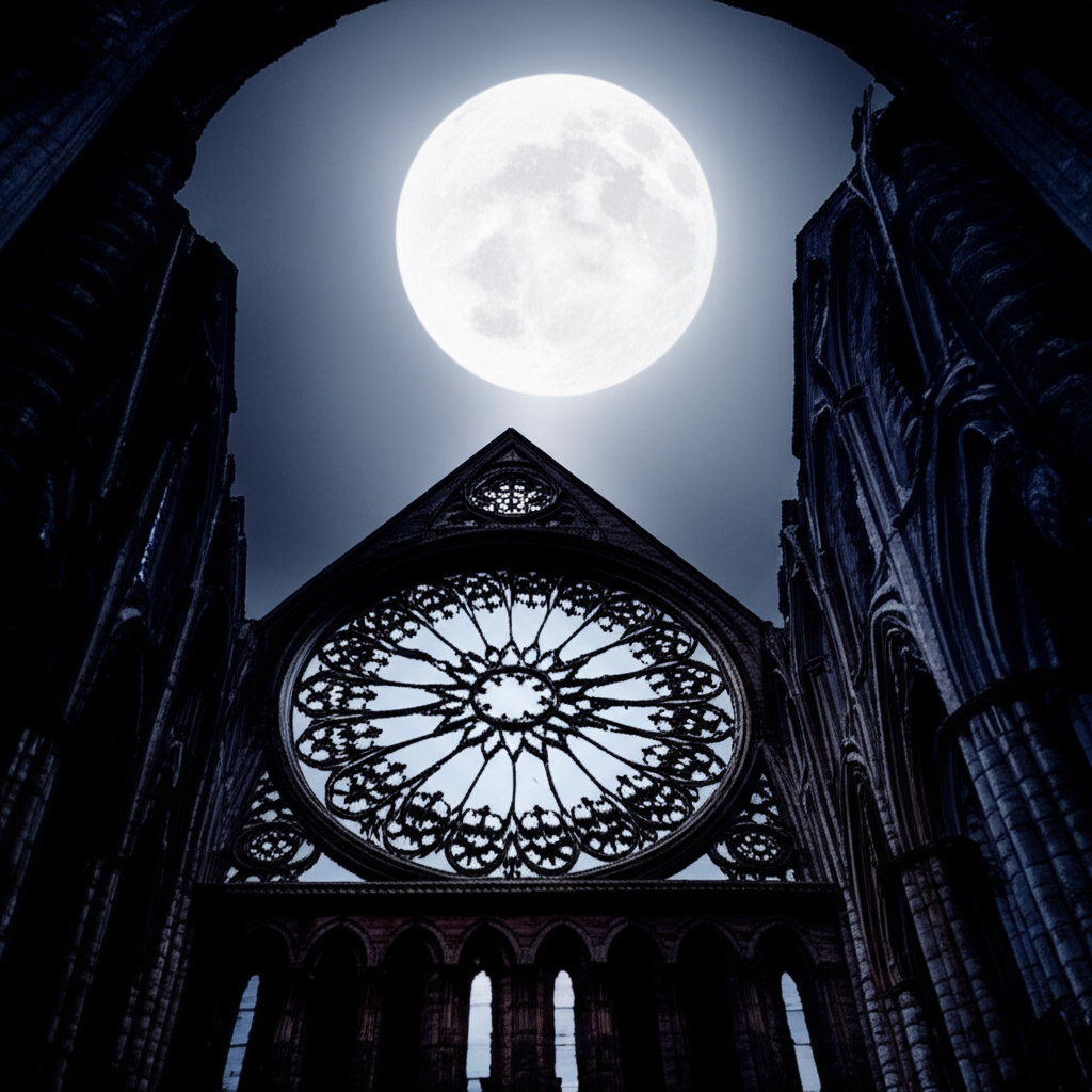 Gothic cathedral ruins, moonlit, shattered rose window