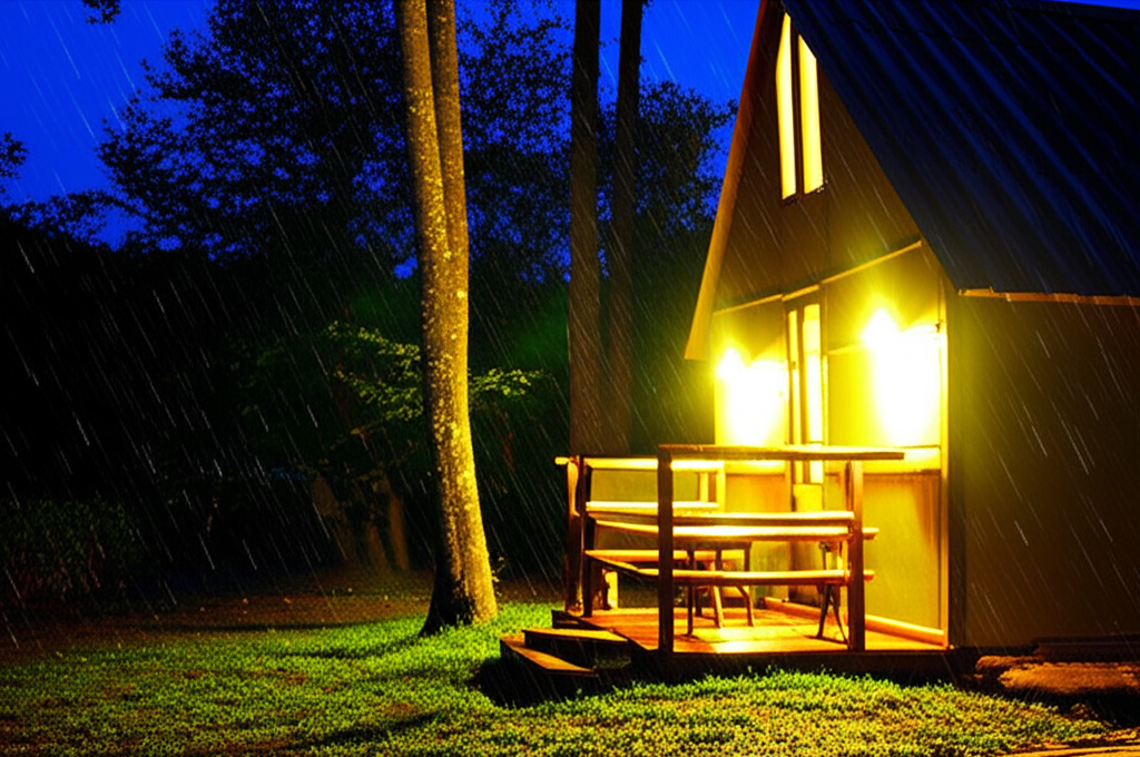 ormandaki kulubede sarı ışıklar ve yağmurlu bir hava