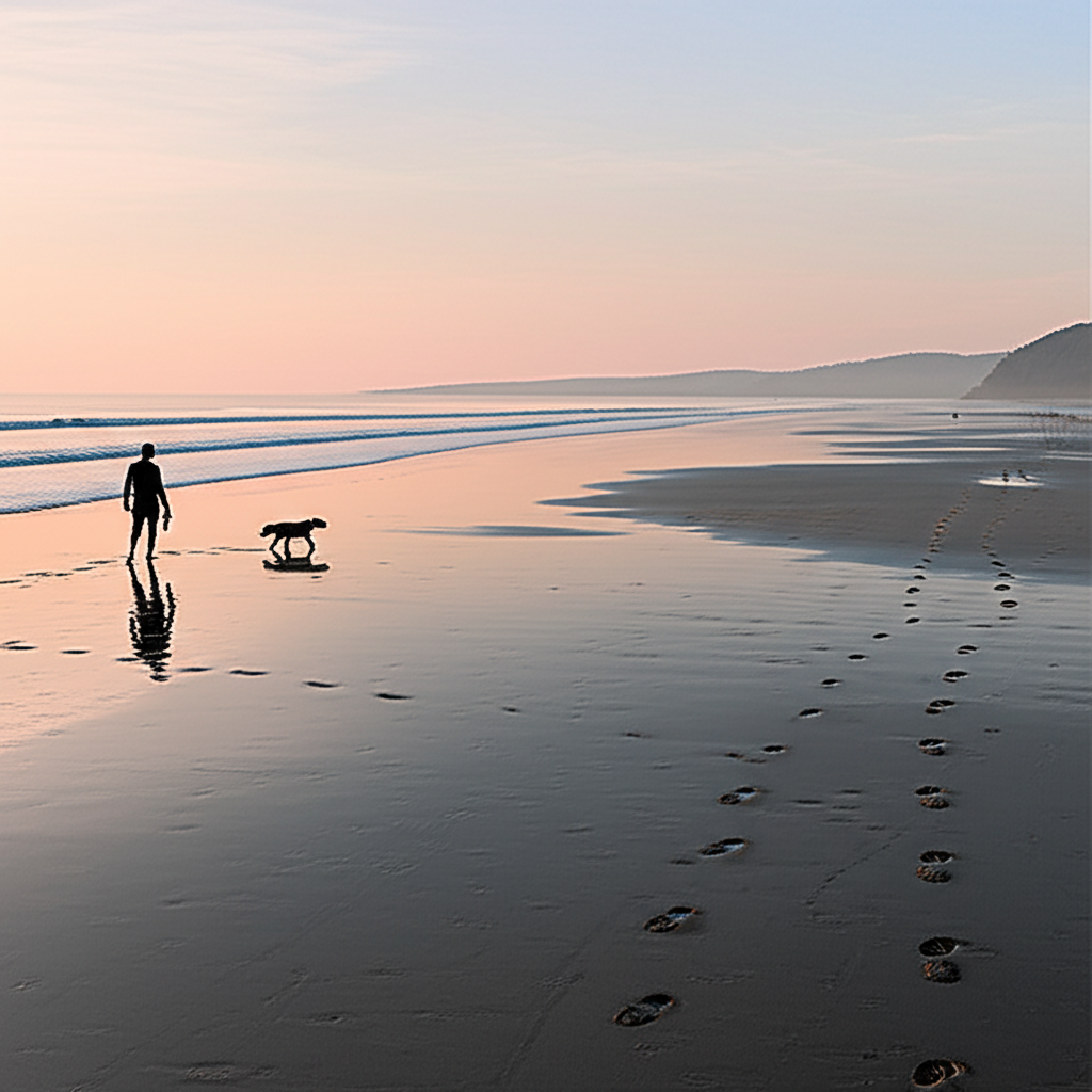 a man walking alone on beach with dog