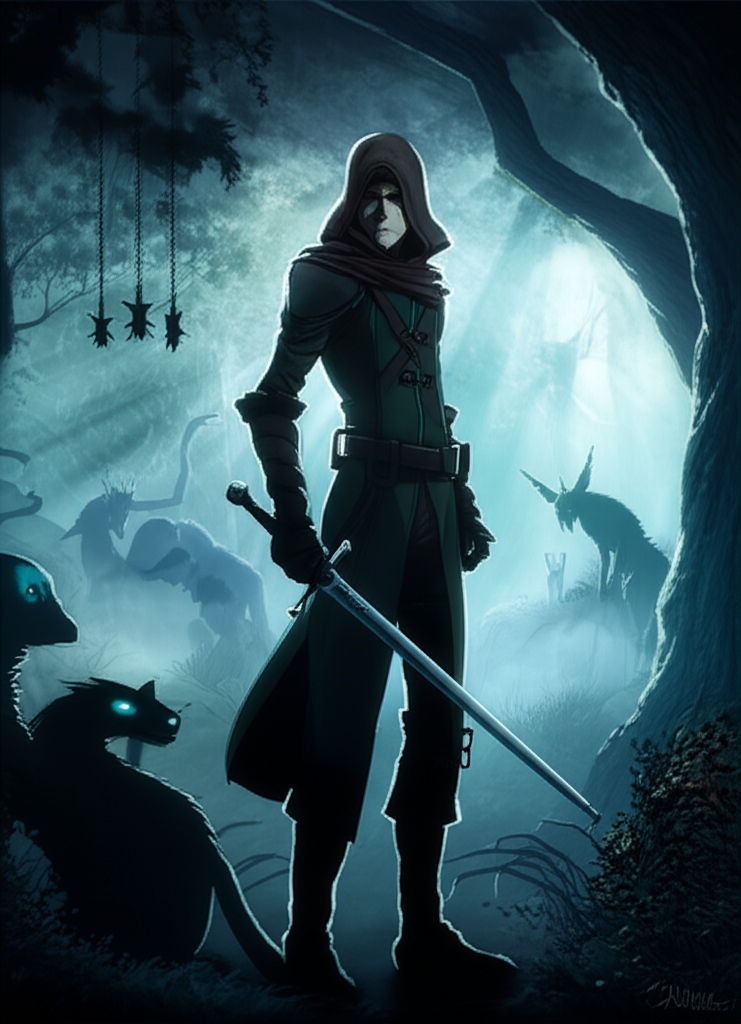A mysterious, cloaked figure with a lean build and an enigmatic expression stands in a moonlit, fog-shrouded ancient forest. He wears dark, utilitarian leather armor beneath his hooded cloak, and wields a sleek, single-edged longsword with a dark hilt, held loosely at his side. Subtle beams of moonlight pierce through the dense canopy, creating dramatic shadows and highlighting the mist. The mood is eerie and suspenseful, with a dark fantasy, realistic render, and a cool, muted color palette dominated by blues and greens., in anime style, depicting creatures