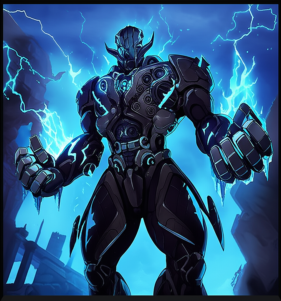 An epic, highly detailed concept art rendering of a black mecha warrior, designed with the majestic power and sculpted physique of a Greek god, wielding formidable cryokinetic abilities. The mecha stands in a dramatic, powerful pose, ice crystal formations emanating from its gauntlets and chest, against a backdrop of stormy, electric-blue skies and ancient, crumbling futuristic ruins. The cool mecha style emphasizes intricate gear mechanisms and glowing blue energy accents on its dark, armored plates, creating a sense of awe and unstoppable force., in fantasy style, depicting characters
